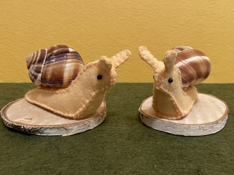 Schnecken sieht man häufiger im Frühling, aber besonders im Herbst, wenn das Wetter etwas feuchter ist. Diese Schnecke ist aus Wollfilz gefertigt und mit gewaschener Schafwolle gefüllt. Auf dem Rücken befindet sich ein echtes Schneckenhaus!