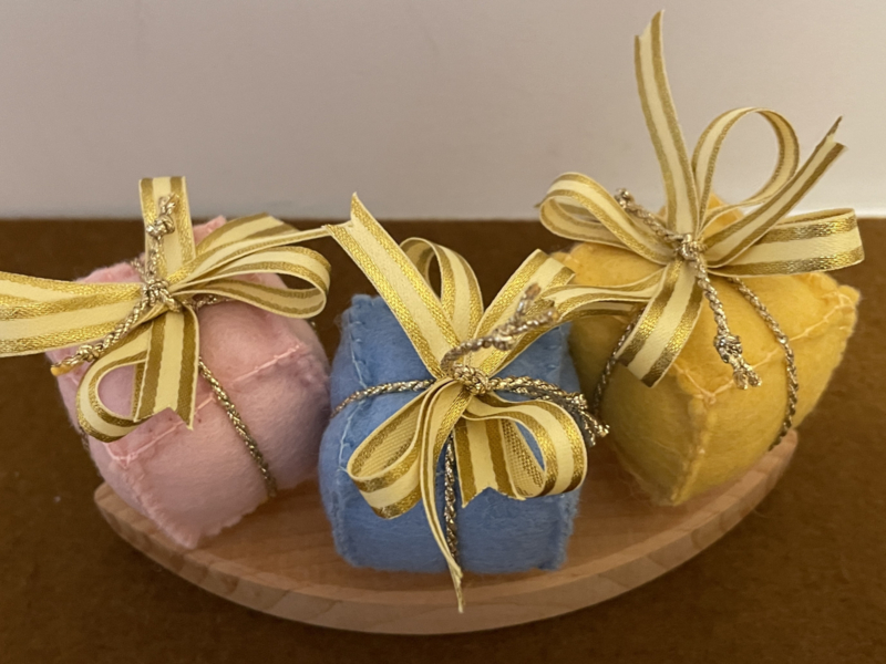 Beautiful studs for the annual ring made of 100% wool felt, and filled with washed sheep's wool. The plugs can be exchanged, and thus be replaced per theme or season.